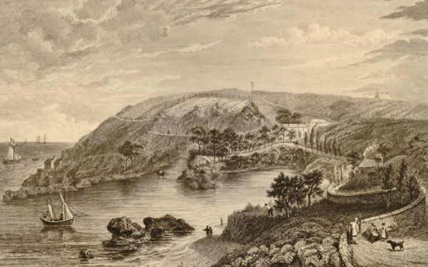 At the second bend, shortly afterwards, before descending to the `vau`, was a path leading down to a levelled area overlooking the Housse Rock and bay. The levelled area, with its retaining bank, had been the site of Belcroute Battery and the bank, its bulwark. The rock, Le Housse, and the rocky area surrounding it, which includes a five foot raised beach, was called by 20th century fishermen `Sally Mitchell`, after the tragic drowning there of a girl of that name. There was formerly situated here a rose arbor with a bench overlooking the sea. Edible Parasol mushrooms were abundant in the autumn.