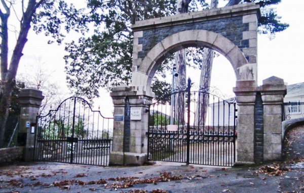 The northern entrance from St Aubin is marked by a large granite archway. From here the drive runs south through woodland following the contours of the cliff above Belcroute Bay, enjoying numerous views of the bay and beyond. It terminates at a gateway set back off the north side of Chemin de Belcroute north of the house. The gateway is flanked by dressed granite piers with pyramid caps.