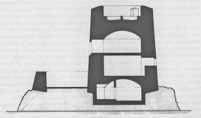 Noirmont Tower, also known as La Tour de Vinde, was built on an offshore rocky outcrop below Noirmont Point in 1811. In common with other Martello-type towers, Noirmont was designed primarily for mounting artillery on the roof platform - man 18-pounder traversing gun. It has a characteristic Martello profile - squat and robust with a battered outer wall of dressed granite. There are no loopholes and very few other openings, the very thick walls themselves providing the main defence.