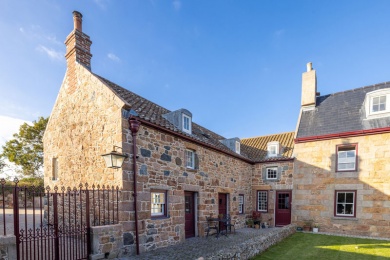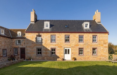 Adjoining the west gable of the house, forming L-plan, is a two-storey range of farm buildings in rubble stone. It is likely that this range was originally single-storey and has earlier origins than the main house. The south-east corner of the building is formed from large blue-grey stones and the granite in the lower sections appears to be of significant age - perhaps 17th century.