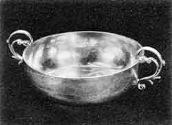 We next come to the various christening and other cups. The earliest of these seem to date from the beginning of the 18th century. They consist of a flat bowl and two artistic side handles. I am afraid not many of the old ones remain but it is interesting to note that this is the one type of old Jersey silver of which modern replicas are made, unfortunately not in Jersey. The modern specimens are made in Birmingham. It is a pity that these beautiful little bowls are not still made here.