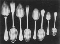 The next and last class is the largest: the spoons, and there must be thousands of Jersey made spoons still in existence. The spoon is perhaps the oldest domestic utensil. One of the oldest, at least in part, still in use, is the anointing spoon used at the coronation of the Kings of England.
