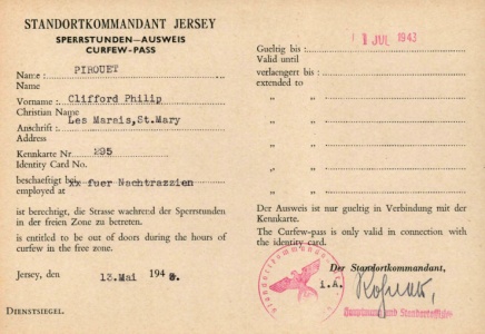 Curfew pass issued to Clifford Pirouet during the Occupation as a member of the St Mary Honorary Police