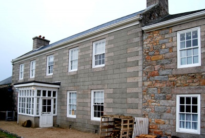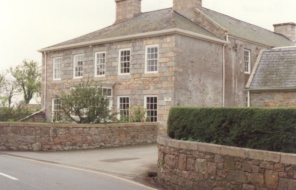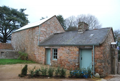 Forming a courtyard to the north and east of the main house is an interesting set of associated mid-late 19th century farm outbuildings. The layout of these buildings is partly influenced by the early curved boundary of the adjacent parish churchyard. The outbuildings includes a range of granite pigsties, and a circa 1870s L-plan two-storey combination shed of a form distinctive to Jersey - of rubble granite with chequered brick dressings and a flattened brick arched throughway.