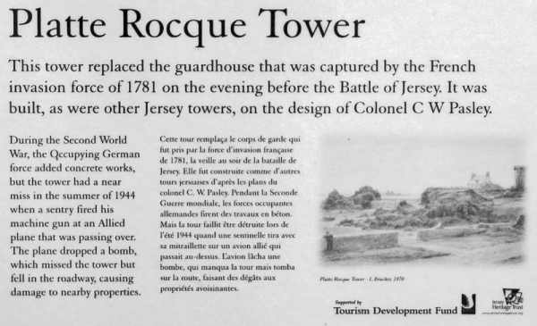 On 19 June 1944, after the Germans opened fire on over flying aircraft with their tower roof mounted twin mounted MG 34 flak guns, a single American Lockheed Lightning Bomber attacked the tower dropping two 560lb bombs which missed the tower, one landing in Robin Bay and the other in the road causing considerable damage to nearby housing.