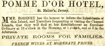 - "Mme Veuve Boisnet a l'Honneur d'informer Messieurs les habitants de cette ile et Messieurs les voyageurs qui frequent les iles Anglaises qu'ils trouveront dans son establishment justement renomme bonne table d'hote a 10 et a 5 heures. Salons particuliers pour les familles et toute les comforts desires. Messieurs les voyageurs de Commerce trouverone tous les renseignements, et de bons magazins pour merchandises. Mme Boisnet a toujours dans cette le Magazin de Commerce trouveront tous Francais et de l'absinthe en gros et en detail." (The widow Mrs Boisnet has the honour to inform the residents of this island and visitors who frequent the English islands that they will find a renowned meal at 10 am and 5 pm. Private rooms for families and all comforts desired. Commercial travellers will find every advice and good shops for their goods. Mrs Boisnet always stocks everything French and absinthe in bulk and for retail.)