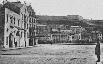 This view across the Weighbridge gardens in the last decade of the 19th century shows the Pomme d'Or immediately behind the statue of Queen Victoria and the building on the opposite corner of Conway Street, also with a 'Pomme d'Or' sign, then being used as a hotel annexe