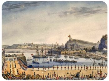 Her Majesty was received on landing by the Lieut-Governor, Major-General Gibbs, the members of the Royal Court and of the States of Jersey, with all the pomp and ceremony due to the august arrival, a number of the most noted ladies of the Island, appropriately attired in white being present on the occasion, and in assembly uniting to sing the National Anthem. The whole of the Insular Militia were under arms, and lined the principal thoroughfares of St Helier, the main streets of which were decorated with triumphal arches.