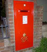 In the reign of Elizabeth II the pillar box is once again affordable, and here's a classic design nicely painted (Green Street). Others are found in the Parade (Elizabeth Place end), nearby inside the Hospital reception area, at Maufant Co-op, Grands Vaux shops, Quennevais estate, St Peter's Co-op, St Ouen shops, and Sandybrook