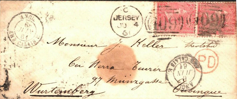 A letter sent from Jersey to Tubingen in Germany in 1861, via England and Calais. Presumably it reached its destination, despite the mis-spelling of the name