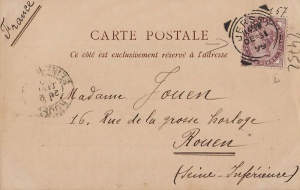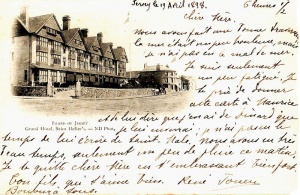A postcard sent to France in 1898. It was postmarked in Jersey on 26 August, travelled by boat to Granville, Normandy, where it was again stamped the following day