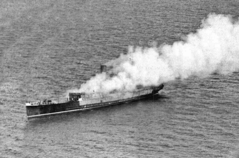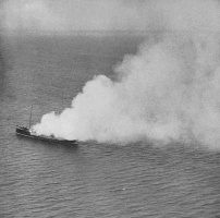 Smoke billows from the stricken ship
