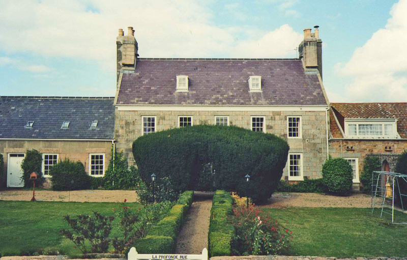 - De Gruchy: The land upon which this house was built at Profonde Rue, has been, from time immemorial, de Gruchy land. It was first built upon in the late 16th century, having become by partage, or inheritance, the property of Jacques de Gruchy, a younger son of Bernabey, of the neighbouring property, La Chasse. After five generations, it was sold in the 18th century, to a distant cousin, Philippe de Gruchy (1738- ), in whose family it remained until comparatively recently, having been the home of Miss Adelaide de Gruchy in the 1920s, the aunt of Edmund de Gruchy. A 19th century owner, Jean de Gruchy, a Captain in the Militia and Trinity registrar, ran from here a most successful cider manufactory