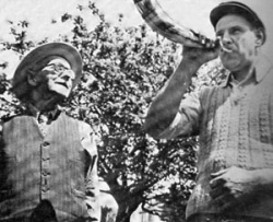 A 1958 photograph of the traditional horn being blown on Midsummer Day