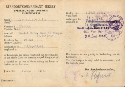 Curfew pass issued to Charles Quenault during the Occupation as a member of the St Saviour Honorary Police [1]