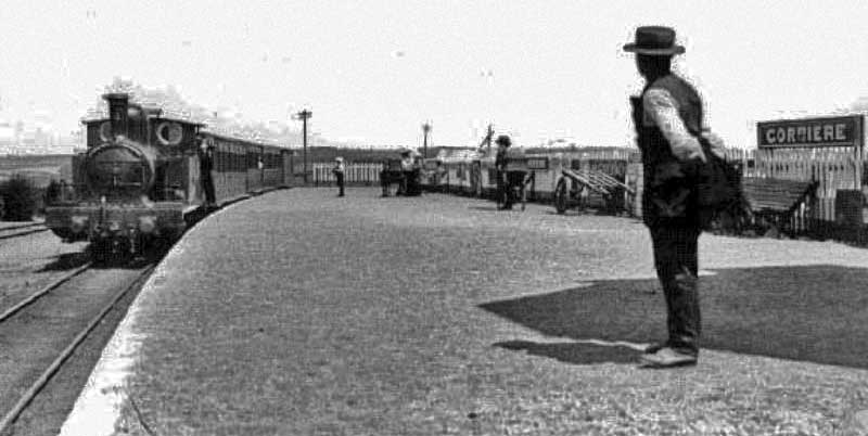 This photograph shows work under way in extending the line past St Aubin towards Corbiere. The loop around the terminus is complete and a train is standing there, but the line and level crossing gates in front of the terminus have yet to be completed