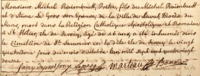 Direct links to lists of baptisms, marriages and burials for the Raimbault family can be found under Family Records opposite. If you want to search for records for a spelling variant of Raimbault, or for any other family name, just click below on the first letter of the