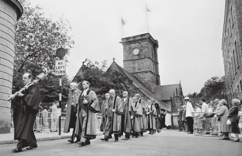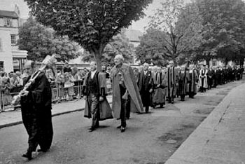 "The beginning of Friday afternoon's sitting was always chaotic, with dozens of lawyers and their clients crowded into the benches and the aisles waiting to pass contracts for the sale of properties. Sometimes it was extremely difficult for the Bailiff to make himself heard above the general hubbub and for he and the Jurats to identify the group, or sometimes groups, of people concerned with a particular contract and to ensure that they all appreciated that their moment had arrived and that they understood what was happening. On one particularly busy and chaotic afternoon proceedings ground to a temporary standstill as Sir Robert struggled to make himself heard and called once again for silence. Then a voice boomed from somewhere on the floor of the court. It was Advocate Peter Giffard, a man renowned for frequent use of strong language, calling out:'This is (expletive) ridiculous'. Everyone had heard and sections of the courtroom tittered, while those on the advocate's benches who recognised the voice of their colleague laughed loudly. Sir Robert's response instantly defused the situation and restored order:'Are you addressing the Court, Advocate Giffard?', he inquired, to the obvious amusement of the whole courtroom, which then fell silent.