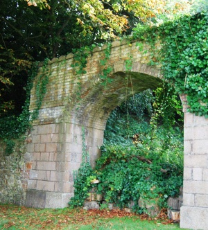 A single-storey white coach house occupies the north side of the service court. Several metres in front of the gateway a cutting turns east off the drive alongside the crenellated service court wall. This was the original approach for visitors to the pavilion, but has been disused for many years. The cutting arrives at a large gate arch set in the south boundary wall.