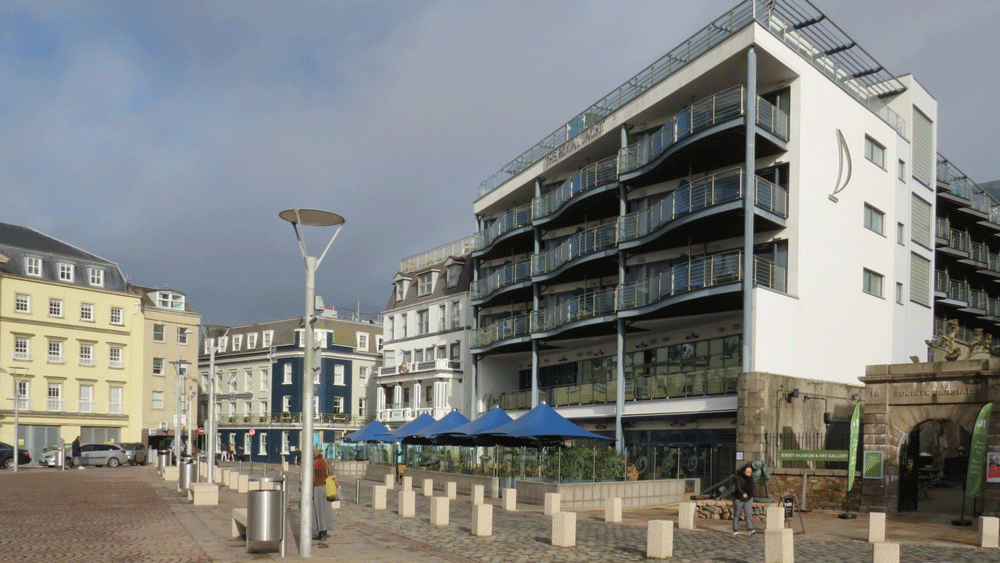 Ownership of the lane between the hotel and the adjoining buildings cannot be determined and the new hotel has been built spanning this gap, but with an open area with glass wall and roof. The facade of the original building has been maintained and a contrasting new building erected on the adjoining site, which was the headquarters of the island's bus company, Jersey Motor Transport, in the second half of the 20th century.