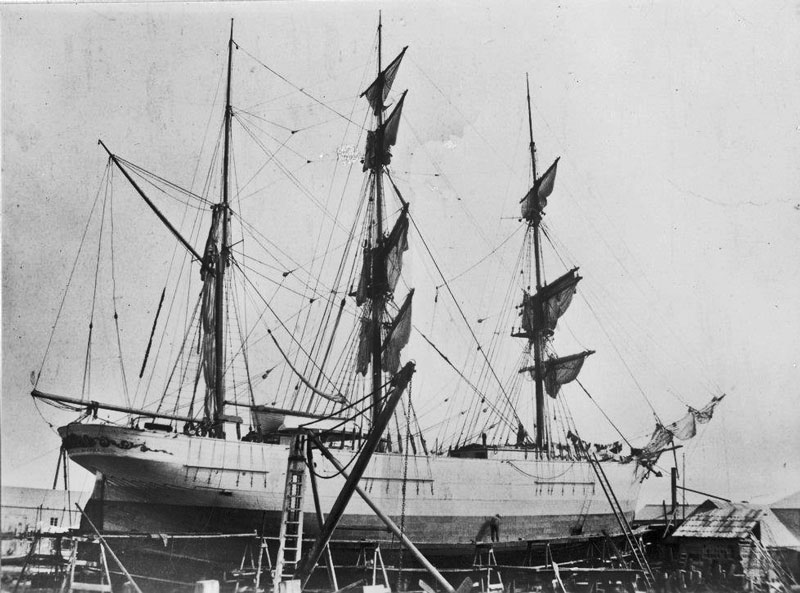 The barque Fleur de Maurice, 317 tons, in an unidentified port. Built 1864 by Clarke, Jersey. Owners: Fr Carrell and Company, Jersey 1864-1870. July 1876 J Walker and Son, registered Port Adelaide. Wrecked when crossing the bar at Port Natal, South Africa, 5 April 1894. Date of photograph circa 1880