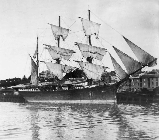 The barque Kassa, 287 tons. Built in 1868 by Esnouf and Mauger, Jersey. Owners: Edward Esnouf, registered Jersey. 1873 William Wells, registered Port Adelaide. July 1874 William Lee Murrell, registered Melbourne. January 1877 Robert Harper. December 1883 ET Miles (of Hobart). November 1884 TM Fisher and others, registered Hobart. Date of photograph circa 1900