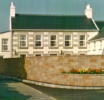 Converted. Main house is two-storey, five-bay. Slate roof with rendered stacks. Frontage rendered with dressed granite quoins on corners and window surrounds.