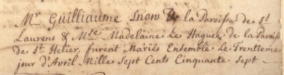 Guillaume Snow married Madeleine Le Haguee in St Helier in 1757