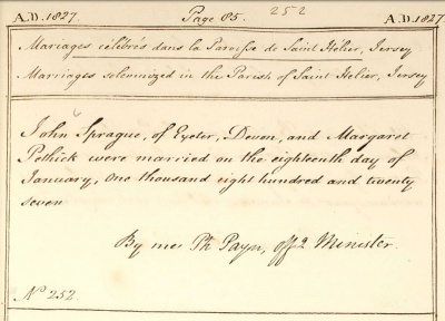 John Sprague married Margaret Pethick in St Helier in 1827