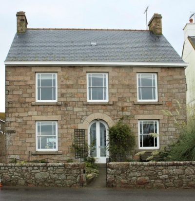 Late 18-early 19th century house retaining some original exterior features, contributing to streetscape opposite La Rocque harbour.