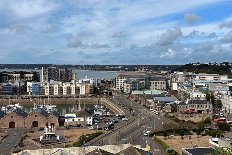 St Helier stretches out behind the Esplanade with People's Park and Victoria Park on the far left