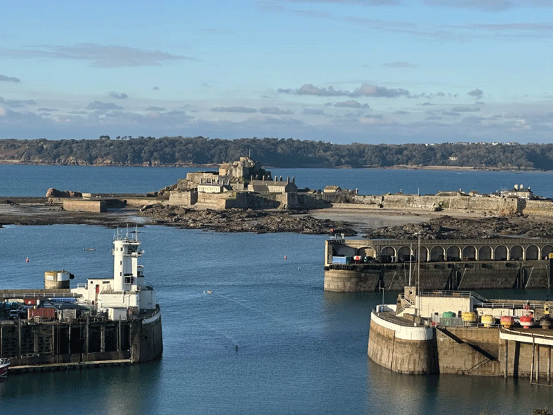 The harbourmouth and Elizabeth Castle beyond, viewed from the back of Victoria Pier in 1957. Now the area in the foreground is all reclaimed land