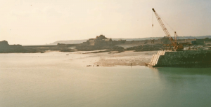 Jersey has a remarkable tidal range. The difference between high and low water on a spring tide can be over 40 feet/12 metres. The actual height of the tide on any particular day will be influenced by atmospheric pressure and weather conditions: high pressure reduces the height of a high tide but makes the water go out even further at low tide; low pressure does the reverse, and if accompanied by strong winds, can lead to extensive flooding on a high tide. These pictures were taken by Jersey Evening Post photographer Glenn Rankine on 18 March 1980 and show the extreme range of the tide on that day. The tide tables which predicted the heights of low and high water in advance forecast high water of 40.4 feet at 7.27 am and low water of -0.1 feet at 2.16 pm, the figures relating to mean sea level. These pictures suggest that high tide was pretty much as predicted, the water lapping over the top of the harbour walls, which were built at 40 feet
