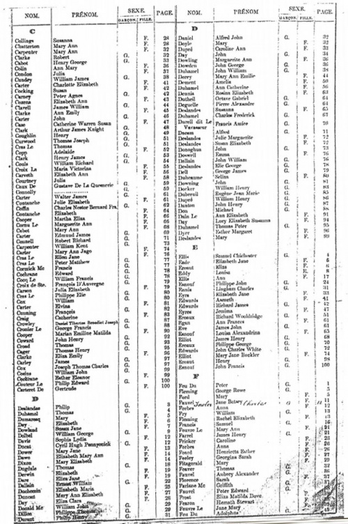 Note that each volume is shown in A to Z order, but for each initial letter the entries are in order of the pages on which they appear in the volume; ie in chronological order. The sex of each child is shown as G(arcon) = boy; F(ille) = girl.