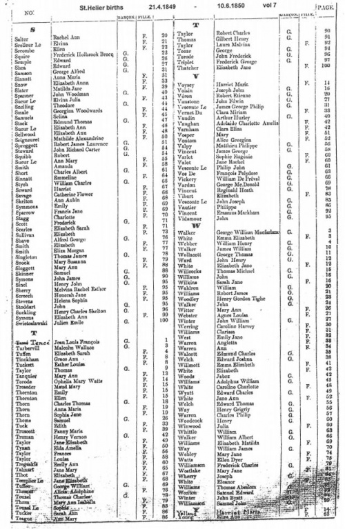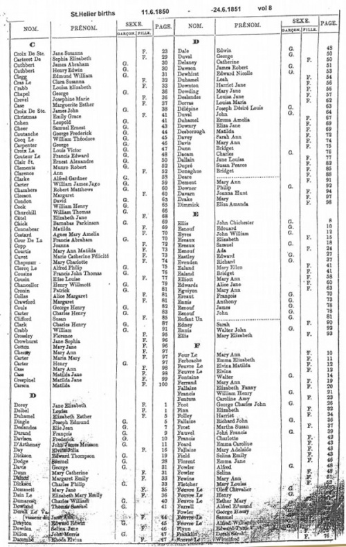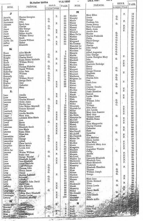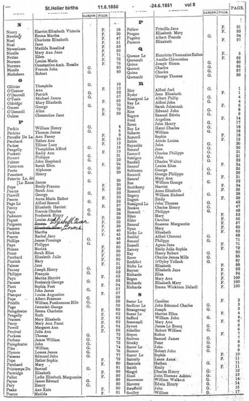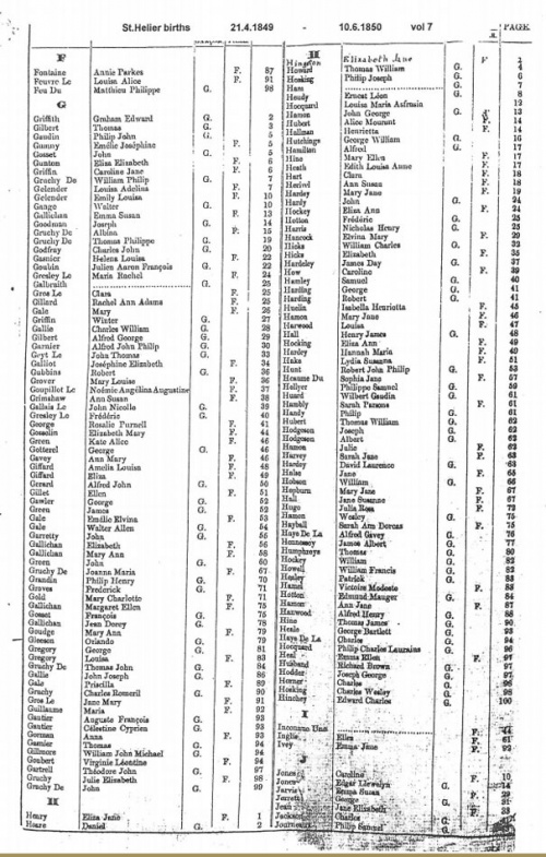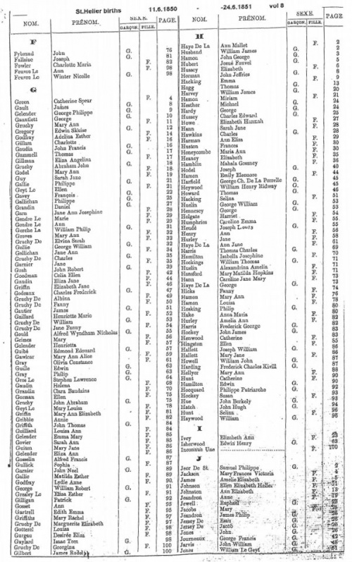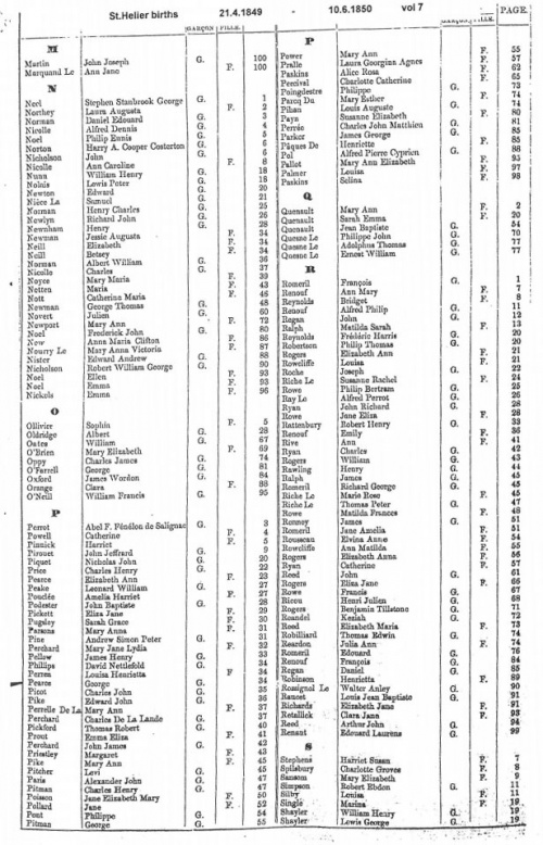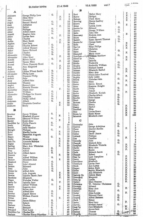 This page contains images of the Registrar's indexes of births registered in St Helier from April 1849 to June 1851