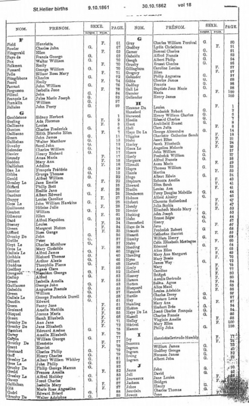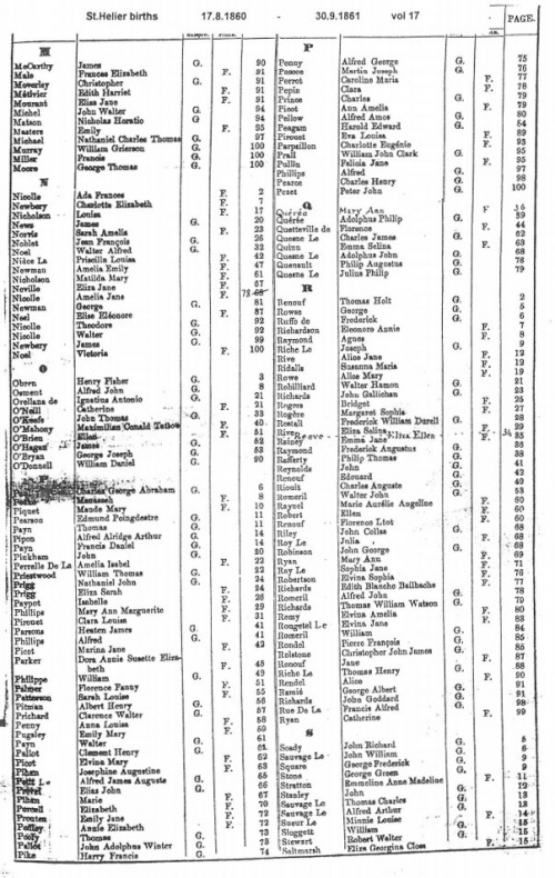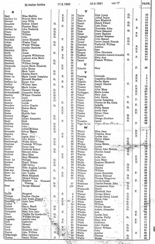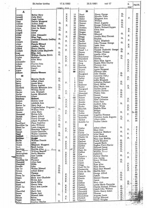 This page contains images of the Registrar's indexes of births registered in St Helier from 17 August 1860 to 30 October 1862.