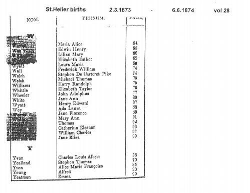 A typical page from the Superintendent Registrar's index of St Helier birth registrations