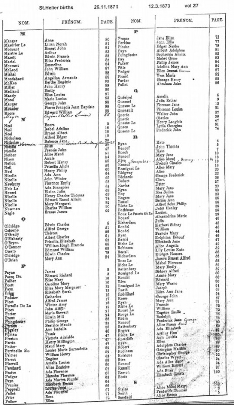 This page contains images of the Registrar's indexes of births registered in St Helier from 26 November 1871 to 6 June 1874