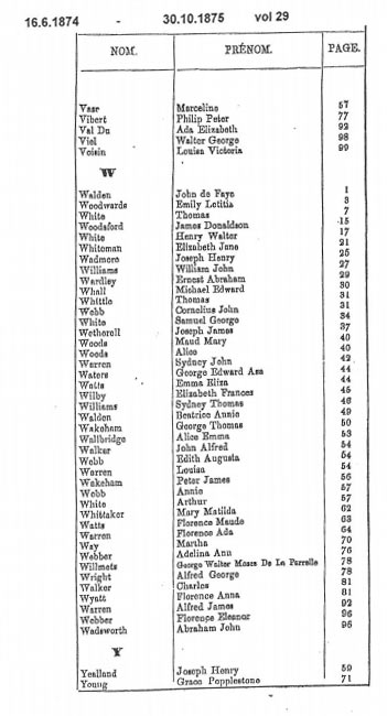 This page contains images of the Registrar's indexes of births registered in St Helier from 16 June 1874 to 23 March 1877