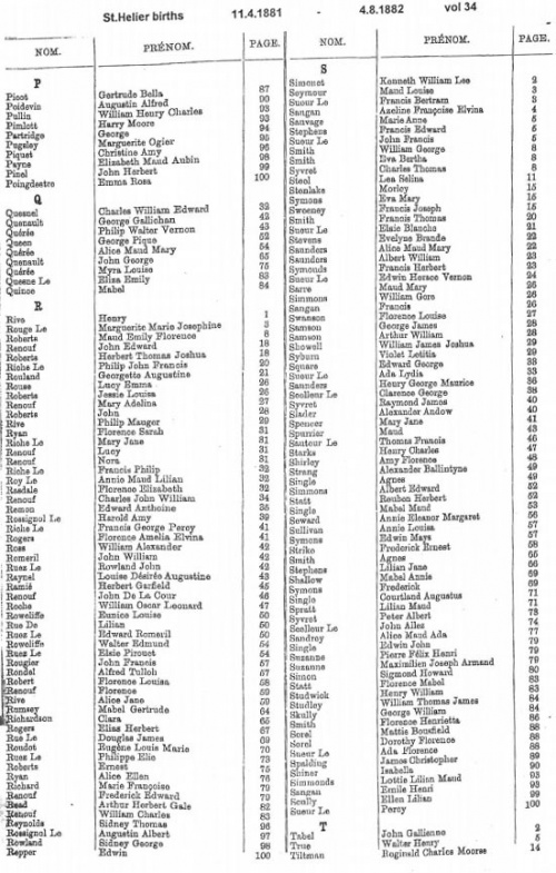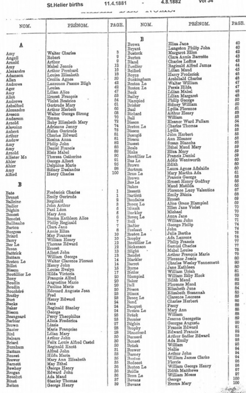 A typical page from the Superintendent Registrar's index of St Helier birth registrations