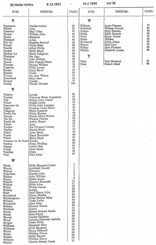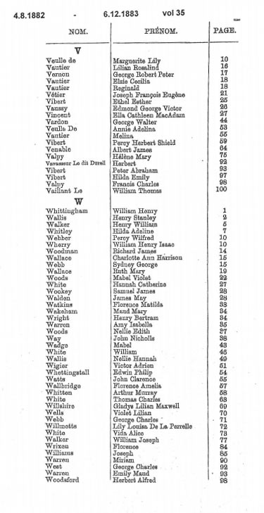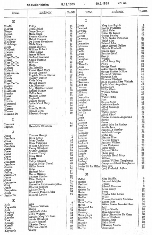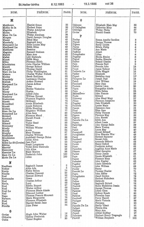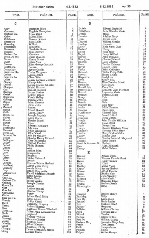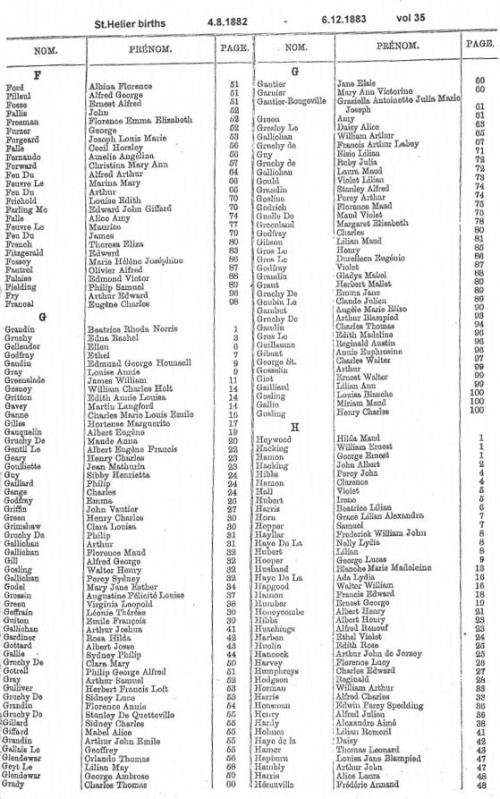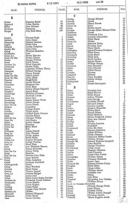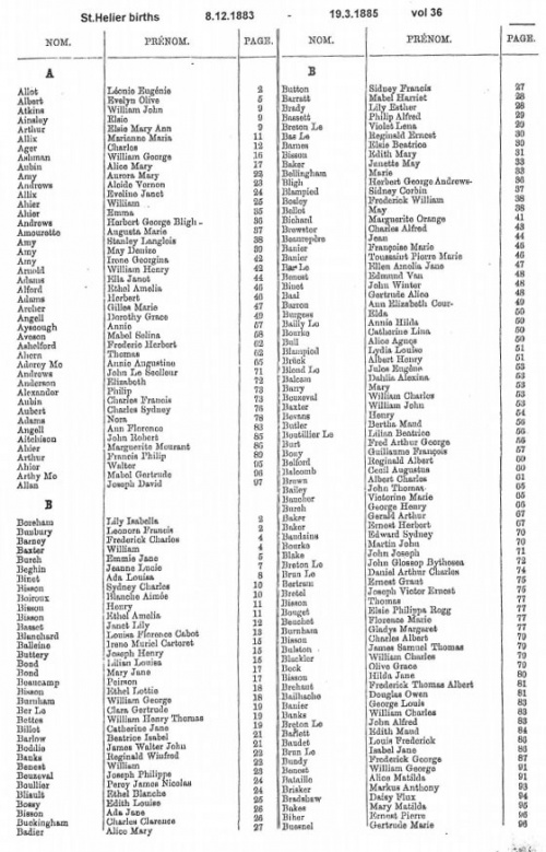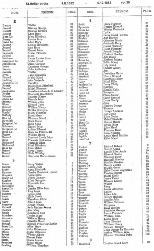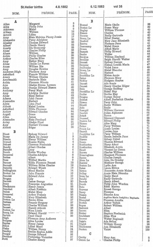 This page contains images of the Registrar's indexes of births registered in St Helier from 4 August 1882 to 19 March 1885