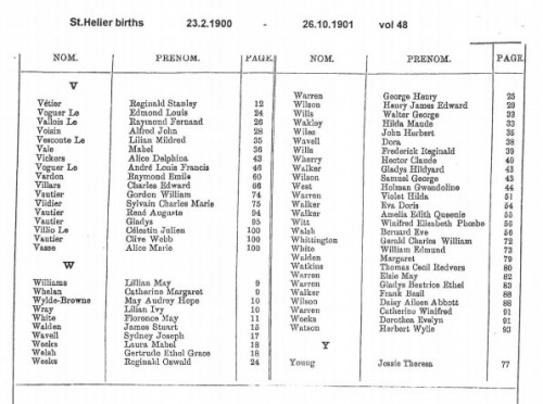 A typical page from the Superintendent Registrar's index of St Helier birth registrations