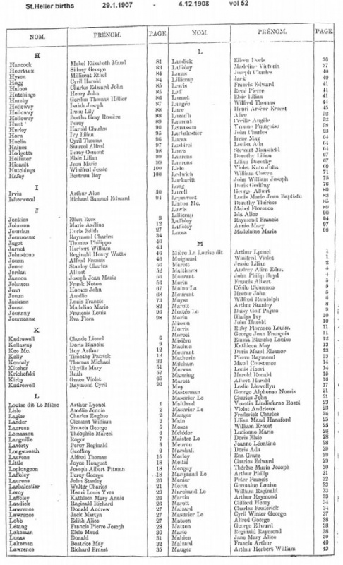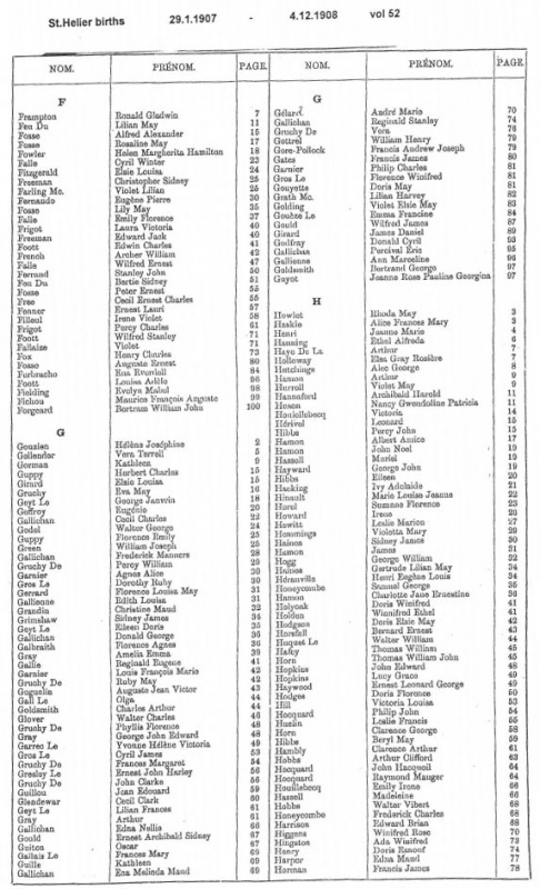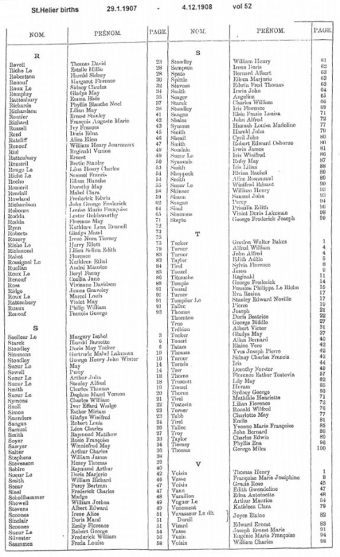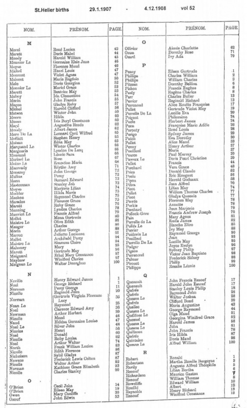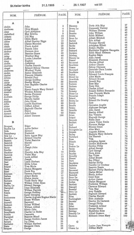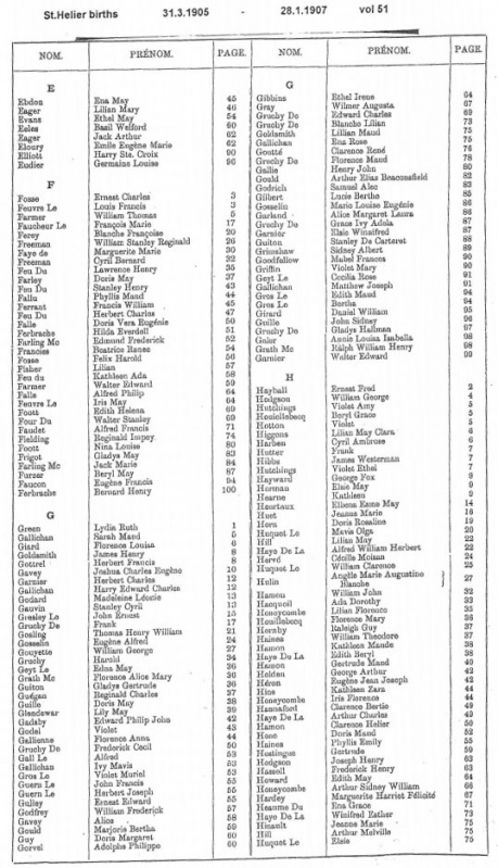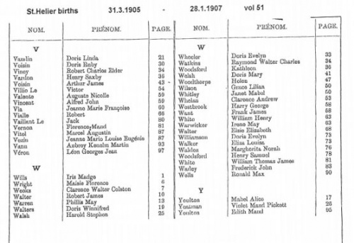 This page contains images of the Registrar's indexes of births registered in St Helier from 31 March 1905 to 4 December 1908
