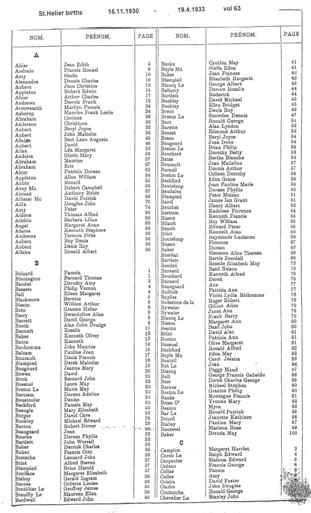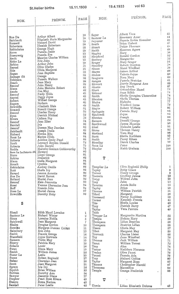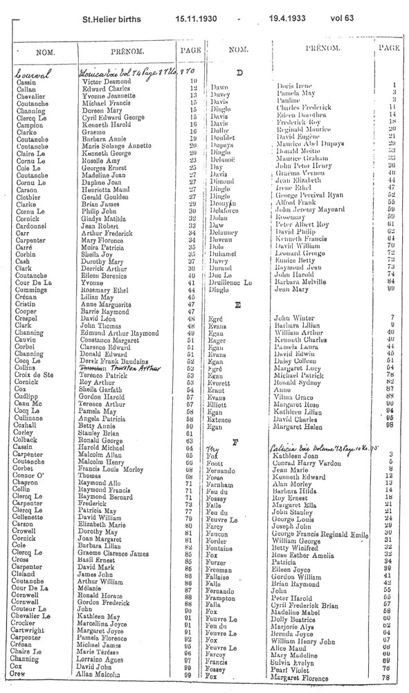 This page contains images of the Registrar's indexes of births registered in St Helier from 15 November 1930 to 19 July 1935