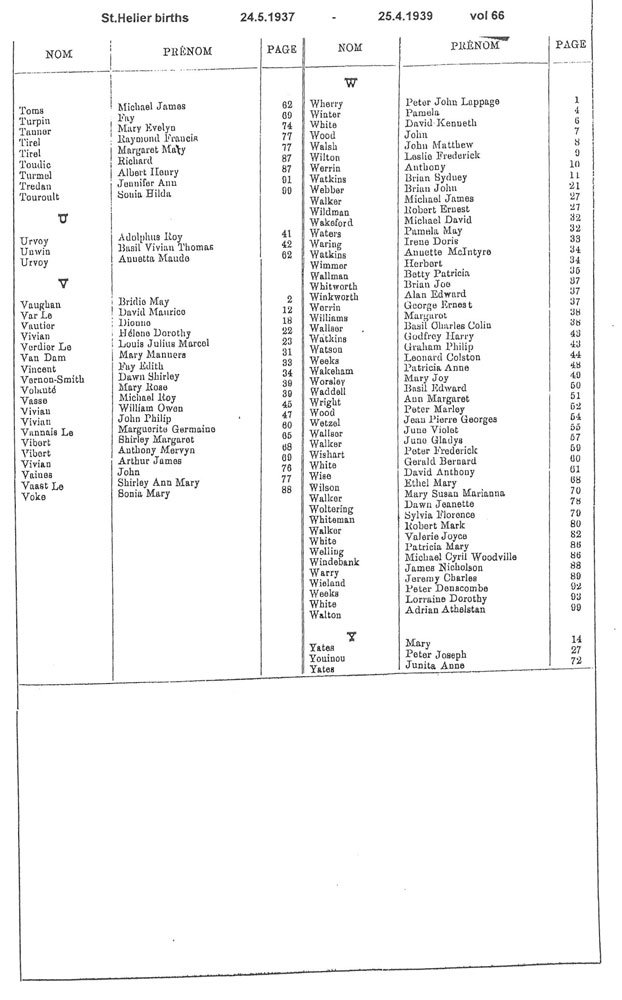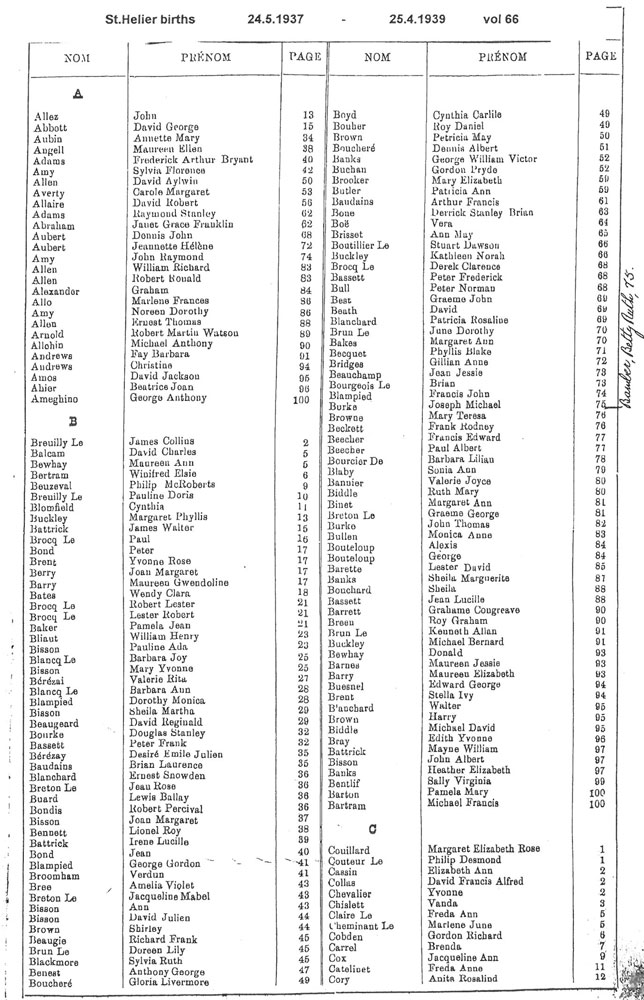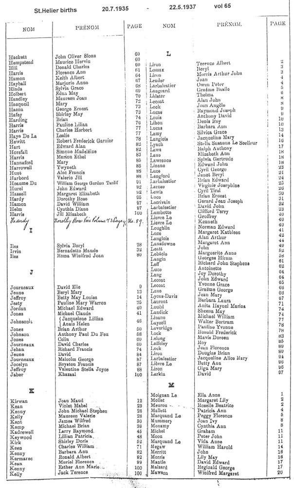 A typical page from the Superintendent Registrar's index of St Helier birth registrations