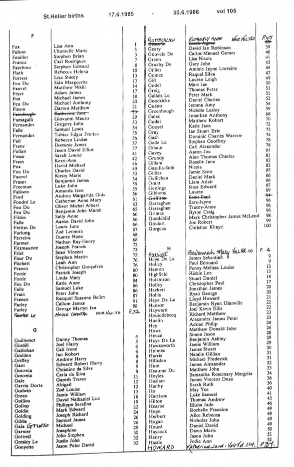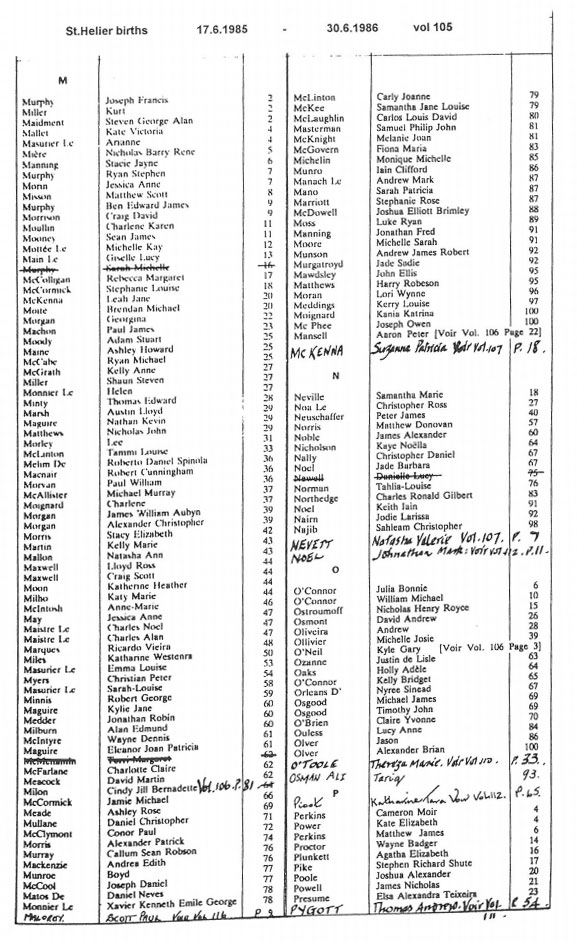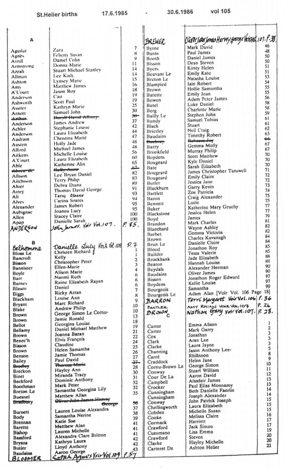 This page contains images of the Registrar's indexes of births registered in St Helier from 17 June 1985 to 3 July 1987