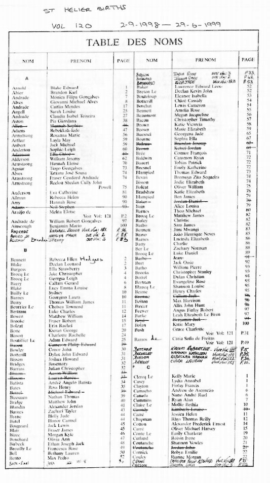 A typical page from the Superintendent Registrar's index of St Helier birth registrations