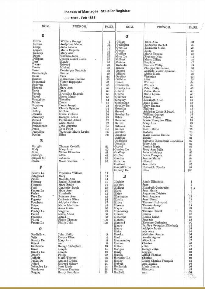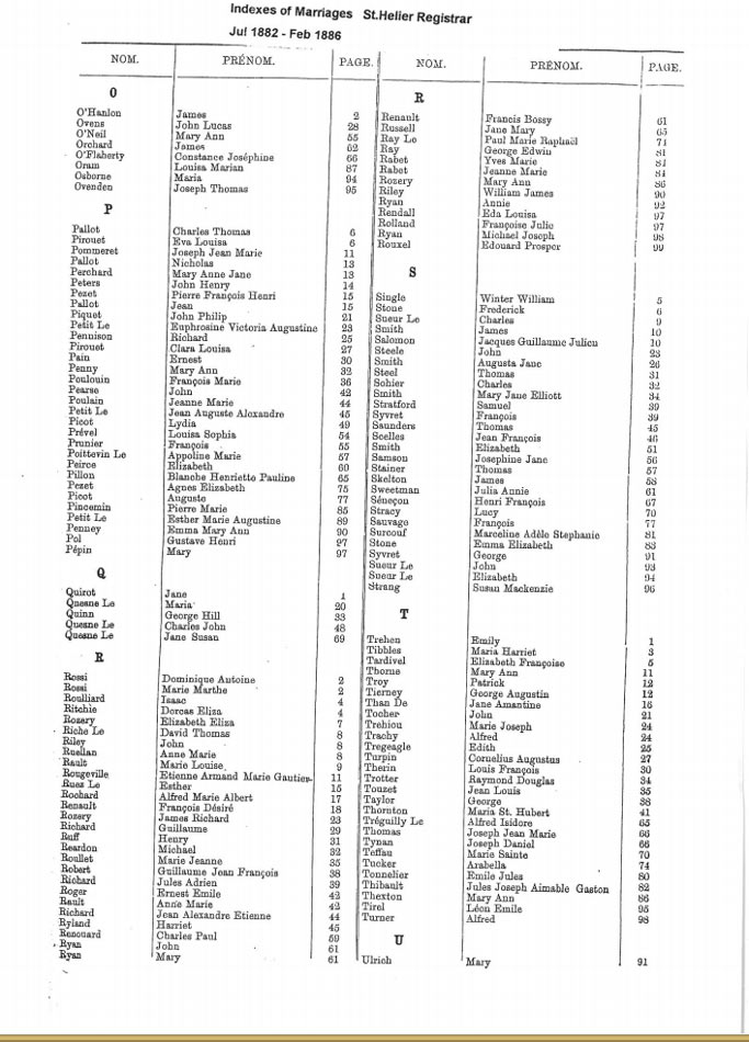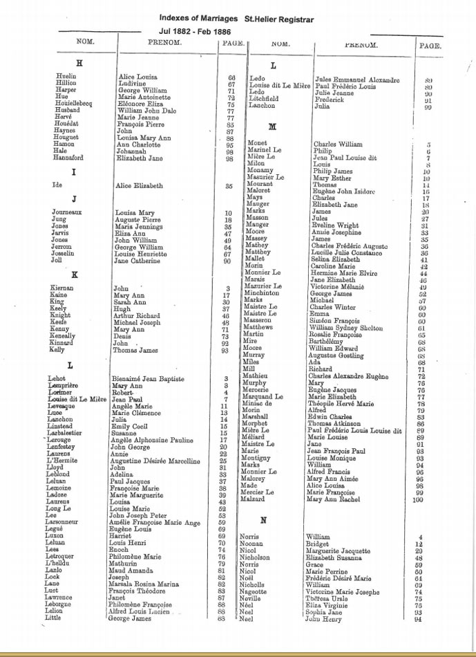 These are images of Register Office indexes of St Helier non-Anglican marriage registrations, covering weddings in non-Anglican churches and the Registry Office. They are provided in this form because this is all that is currently available online. We do not currently have the necessary resources to create a full index for the individual records. You can estimate the date of the marriage more accurately by referring to the page numbers for records in each set. Lower page numbers are at the beginning of the date range, higher numbers at the end of the range. The index does not combine groom and bride to provide a full marriage record, but if you identify one party, the other will appear on the same page.