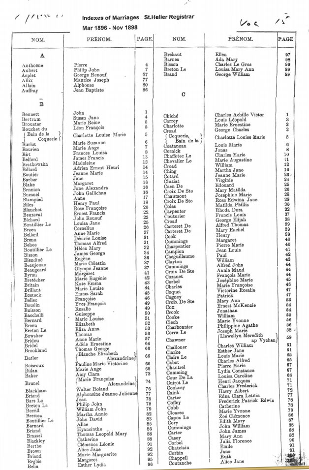 These are images of Register Office indexes of St Helier non-Anglican marriage registrations, covering weddings in non-Anglican churches and the Registry Office. They are provided in this form because this is all that is currently available online. We do not currently have the necessary resources to create a full index for the individual records. You can estimate the date of the marriage more accurately by referring to the page numbers for records in each set. Lower page numbers are at the beginning of the date range, higher numbers at the end of the range. The index does not combine groom and bride to provide a full marriage record, but if you identify one party, the other will appear on the same page.