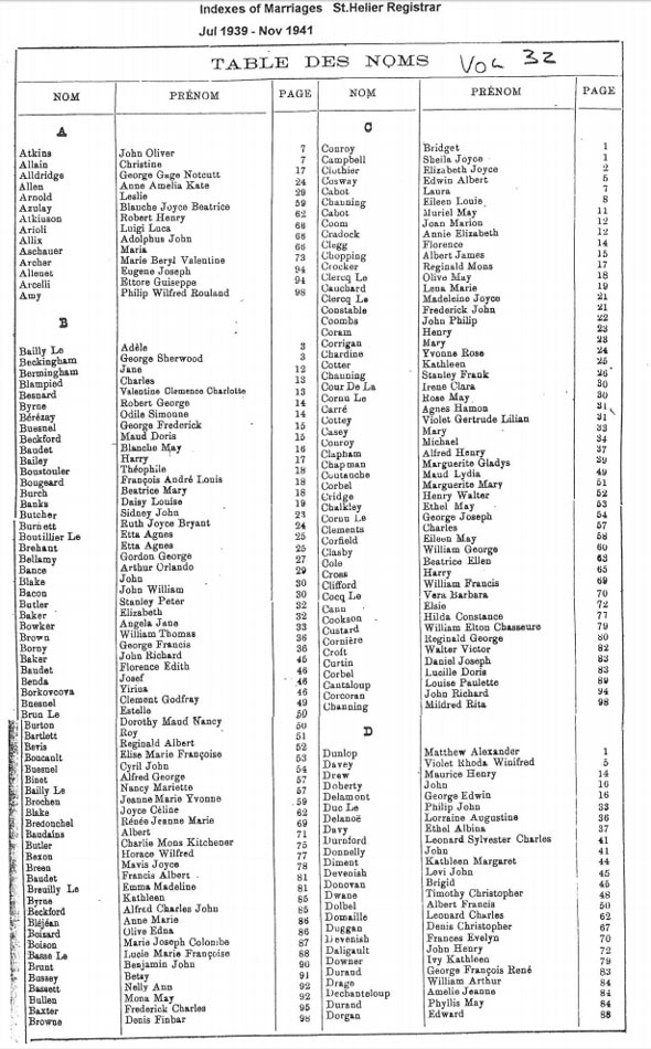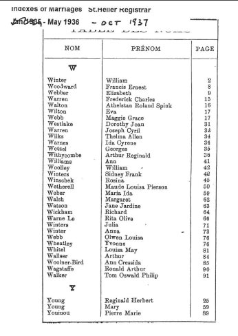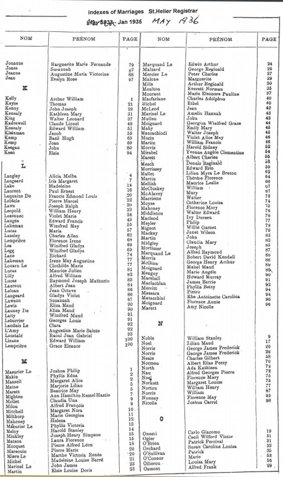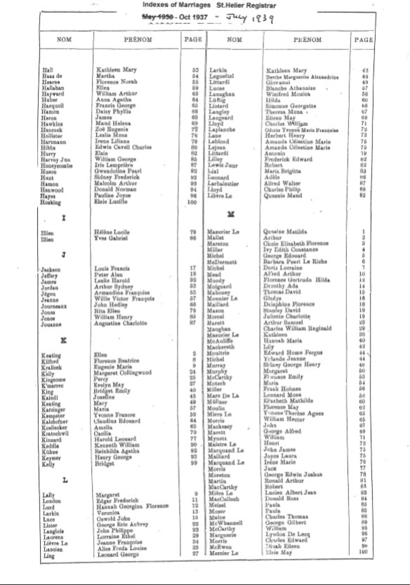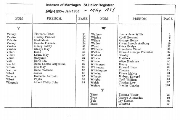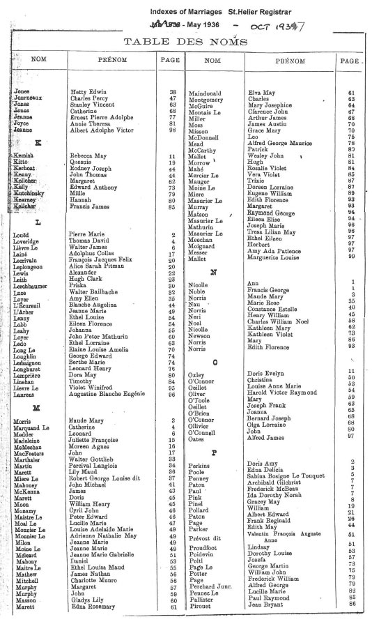 These are images of Register Office indexes of St Helier non-Anglican marriage registrations, covering weddings in non-Anglican churches and the Registry Office. They are provided in this form because this is all that is currently available online. We do not currently have the necessary resources to create a full index for the individual records. You can estimate the date of the marriage more accurately by referring to the page numbers for records in each set. Lower page numbers are at the beginning of the date range, higher numbers at the end of the range. The index does not combine groom and bride to provide a full marriage record, but if you identify one party, the other will appear on the same page.